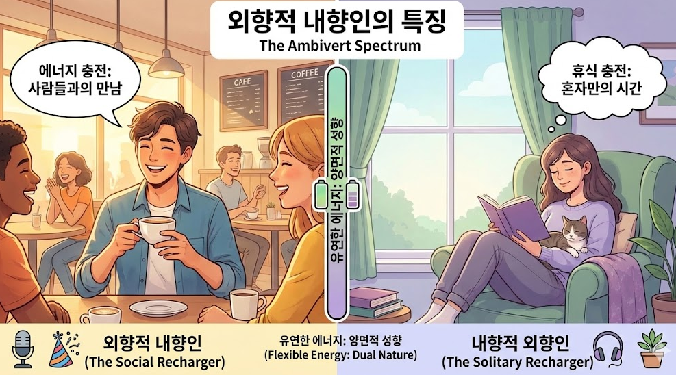 심리학에서는 이를 '앰비버트(Ambivert, 양향성 성격)'라고도 합니다. 외향성과 내향성의 스펙트럼 중간 어디쯤 위치한 이들은 상황에 따라 유연하게 대처하는 능력이 뛰어납니다. 하지만 문제는 '에너지의 원천'입니다.