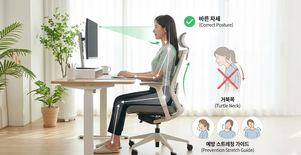 시선이 아래로 향하면 목 뒤 근육이 과하게 긴장합니다. 모니터 받침대나 두꺼운 책을 활용해 모니터 상단이 내 눈높이와 수평이 되게 하세요. 자연스럽게 턱이 당겨지며 거북목을 예방할 수 있습니다.